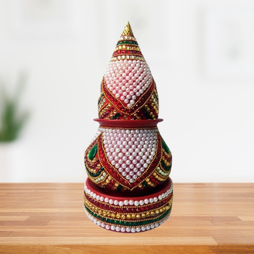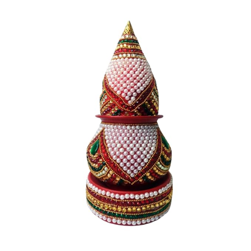 this set of 3 decorative pooja kalash with nariyal includes beautifully crafted shreefal, lota, and round kalash, each measuring 10 x 10 x 24 cm. made using a premium mix of wood, aluminium, and stone, this set is perfect for enhancing the spiritual atmosphere of your home, temple, or office. ideal for use during marriage functions, festivals, and daily poojas, it combines traditional design with decorative appeal. whether used in rituals or as a part of your home décor, this kalash set is a meaningful addition to any space.