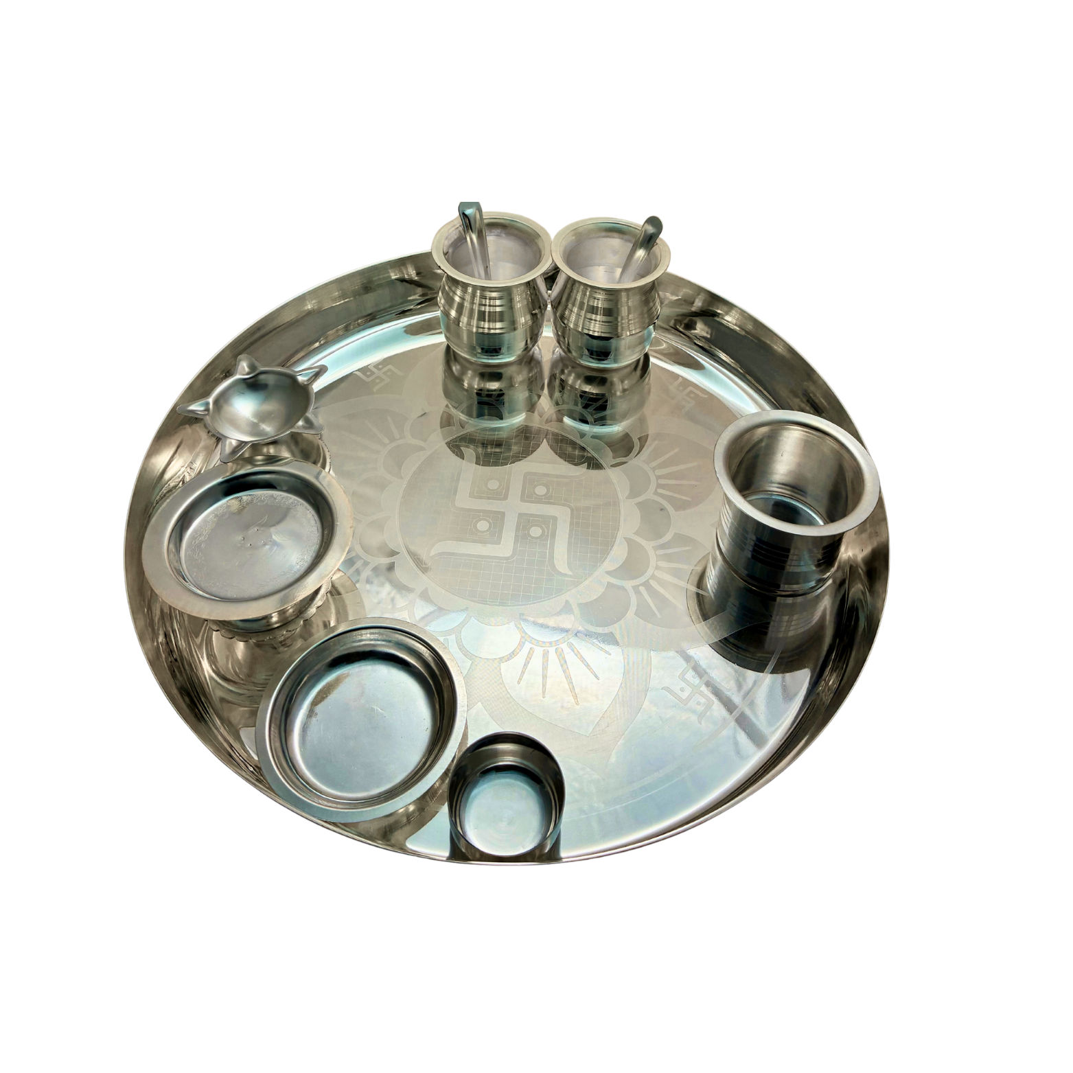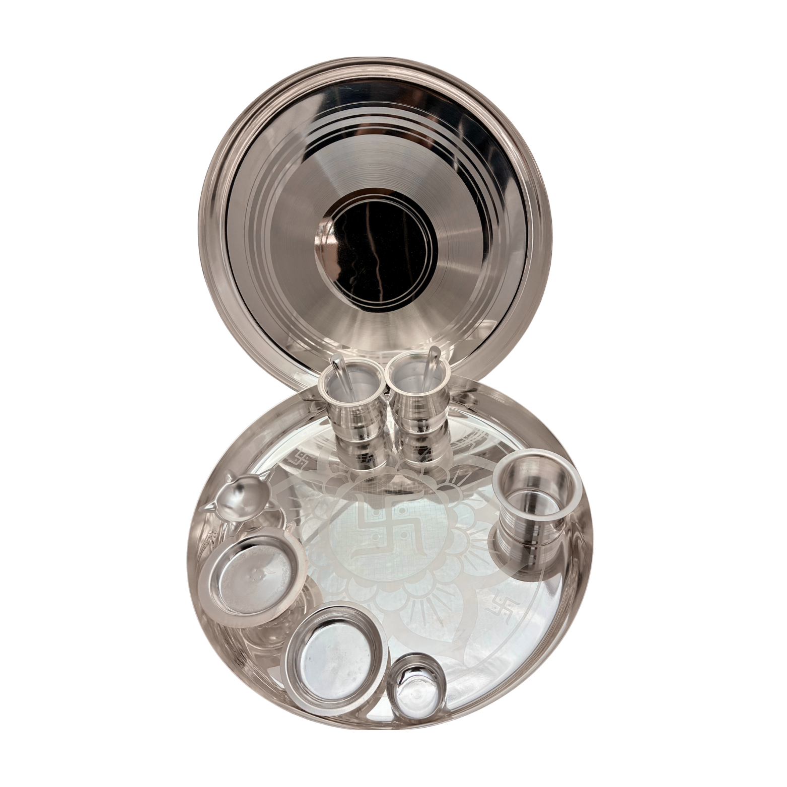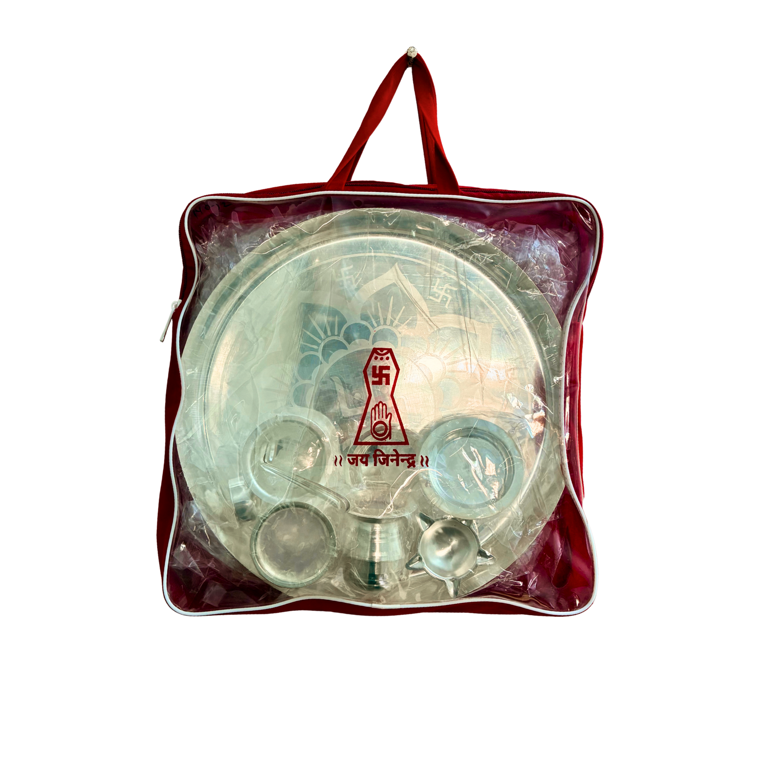 Enhance your spiritual rituals with our luxurious Jain Thali Set, meticulously crafted from Pital (Silver) with a premium German Silver finish. This 11-piece set includes essentials like a Kumkum holder, Akshat (rice grains) holder, and a beautifully adorned Kalash (pot), all elegantly arranged in a substantial 10-inch thali. Perfect for religious ceremonies, gifting, and personal devotion, this finely designed set adds a touch of elegance and tradition to every prayer.