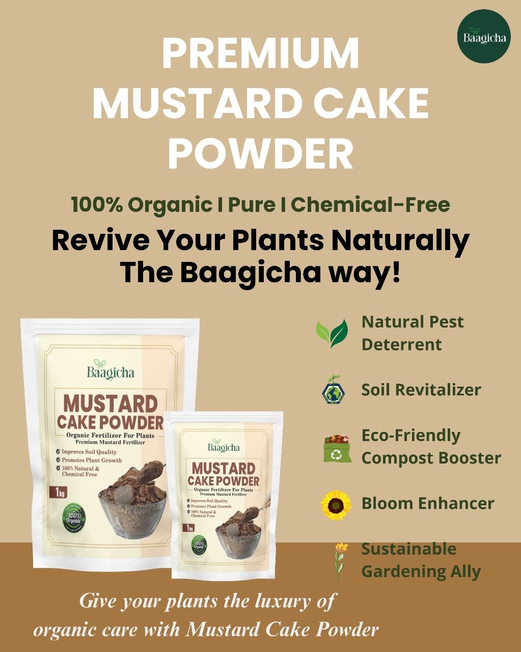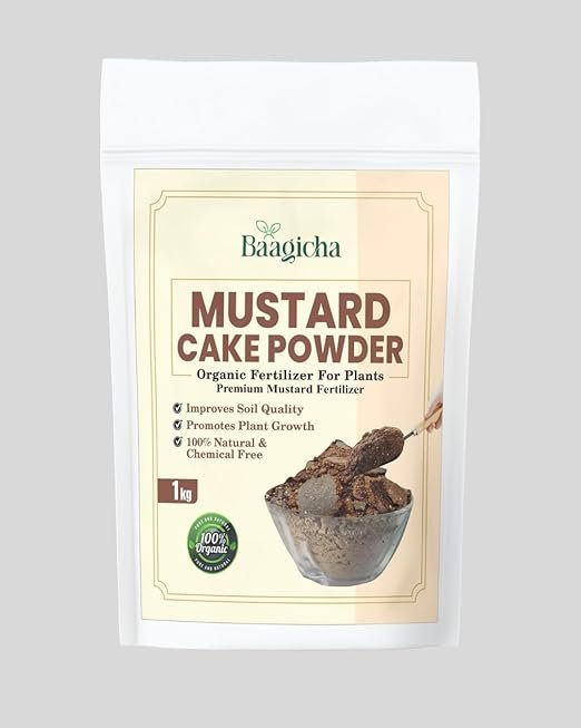 Upgrade your garden with Baagicha Premium Mustard Cake Powder, a 100% natural and organic fertilizer trusted by gardeners for healthy, vibrant plants. Packed with proteins, natural NPK (Nitrogen, Phosphorus, Potassium) and essential micronutrients, it is the perfect plant food for vegetables, flowers, fruits, and indoor plants. How It’s Made? Made from 100% cold-pressed mustard seeds, Baagicha Mustard Cake Powder is produced after oil extraction, then finely ground to retain proteins and nutrients. This ensures a premium, slow-release organic fertilizer that keeps feeding plants for weeks. Why Choose Baagicha Premium Mustard Cake Powder? 1. Organic NPK Fertilizer – complete plant food with balanced nutrients 2. Protein-Rich Plant Growth Booster – enhances leaf, root & stem strength 3. Natural Pest Resistance – mustard oils keep soil healthy & pest-free 4. Improves Soil Quality – boosts microbial activity & fertility naturally 5. Eco-Friendly & Chemical-Free – safe for soil, pets, and people